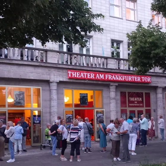 Mit seiner Lage in der Karl-Marx-Allee, im Zentrum Berlins, gehört das Theater am Frankfurter Tor zu den bekanntesten Spielstätten der Hauptstadt. Im Programm des Theaters, dessen künstlerische Leitung seit Juni 2023 Johannes Hallervorden innehat, präsentiert einen bunten Mix aus Kabarett, Comedy, Theater, Lesungen und Konzerten. Nicht umsonst ist die Location mittlerweile aus dem Berliner Kulturleben nicht mehr wegzudenken. Das Theater bietet 99 Besucherinnen und Besuchern platz. Die kleine, aber sehr feine Bar lädt außerdem vor und nach den Vorstellungen zum Verweilen und Genießen ein. Sichern Sie sich ihre Tickets und erleben Sie das abwechslungsreiche Programm vom Theater am Frankfurt Tor live.