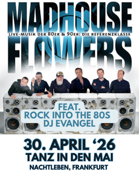 Seit nunmehr 30 Jahren rockt die Frankfurter Coverband Madhouse Flowers die Bühnen! Neben zahlreichen Auftritten mit Rock- und Pop-Ikonen wie Jethro Tull, Hot Chocolate, Juli oder Extrabreit im Line-up waren sie sogar als Gast-Act bei Thomas Gottschalks „50 Jahre Rock“ im ZDF eingeladen. Die Band, bestehend aus insgesamt sechs Musikern, darunter zwei Gitarristen und zwei Keyboardern, ist musikalisch breit aufgestellt und will sich nicht auf einen bestimmten Musikstil festlegen. Von Billy Idol über Depeche Mode bis hin zu Coldplay – bei Madhouse Flowers ist für jeden etwas dabei! Besonders der walisische Frontsänger und Gründungsmitglied Chris Stinchcombe schlüpft bei seinen Auftritten in die Rolle der jeweiligen gecoverten Band und scheut hierfür, wie bei der Imitation von Tina Turner, nicht mal vor High Heels, Strapsen und Minirock zurück!