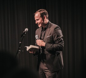 Moderator Johannes Elster begrüßt fünf Slam Poet*innen aus dem deutschsprachigen Raum, die sich einem literarischen Wettbewerb stellen.